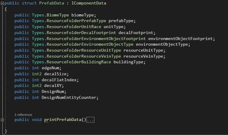The list of converted entities is then looped through and the Blob Asset is created with the help of the PrefabData struct accompanying the game object. This allows us to keep our Blob Arrays separate and orderly. This is still a work in progress, but the concept of loading the GameObjects, converting them using the method described above, and then creating a usable blob asset from them has been tested successfully on a smaller scale. It is now just a matter of moving our multitudes of prefabs into the newly defined Resources folder.