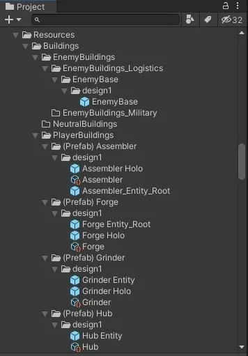 The new structure of the Resources folder is arranged in a way that utilizes folder names that match enums. These enums are then used to populate the variables within a list of PrefabData structs that is created parallel to the list of loaded GameObjects. This PrefabData struct contains information useful to us when converting these loaded GameObjects to Blob Assets. Different types of GameObjects need to be in different Blob arrays, such as player building entities vs map tile entities. The folder path for each loaded GameObject is split up and parsed into their enums which allow us to add the proper data to the PrefabData struct for that particular type of GameObject.